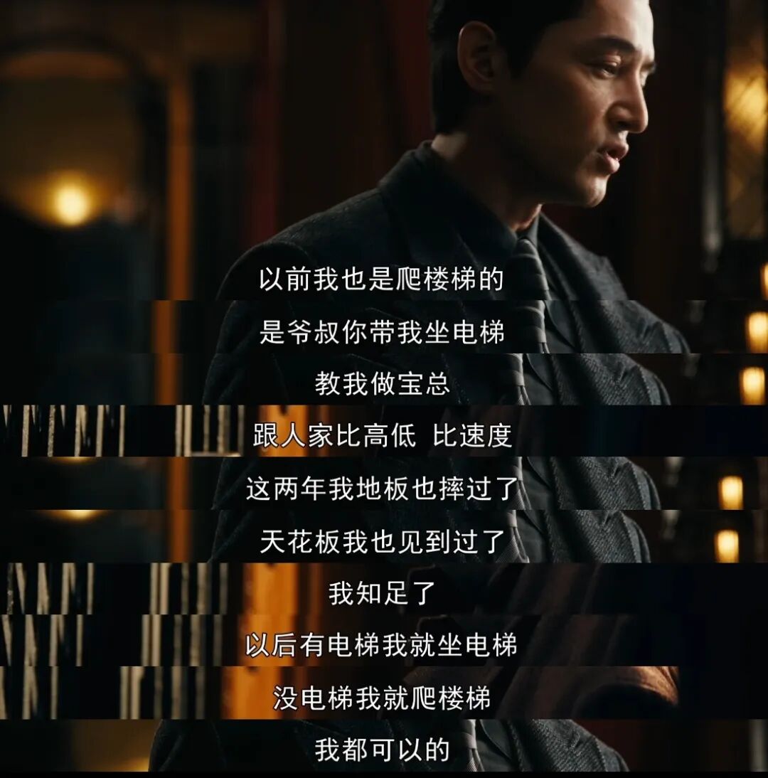 以前我也是爬楼梯的 ,是爷叔你带我坐电梯,教我做宝总,跟人家比高低 、比速度。这两年我地板也摔过了 ,天花板我也见到过了,我知足了 。以后有电梯我就坐电梯,没电梯我就爬楼梯,我都可以的 。