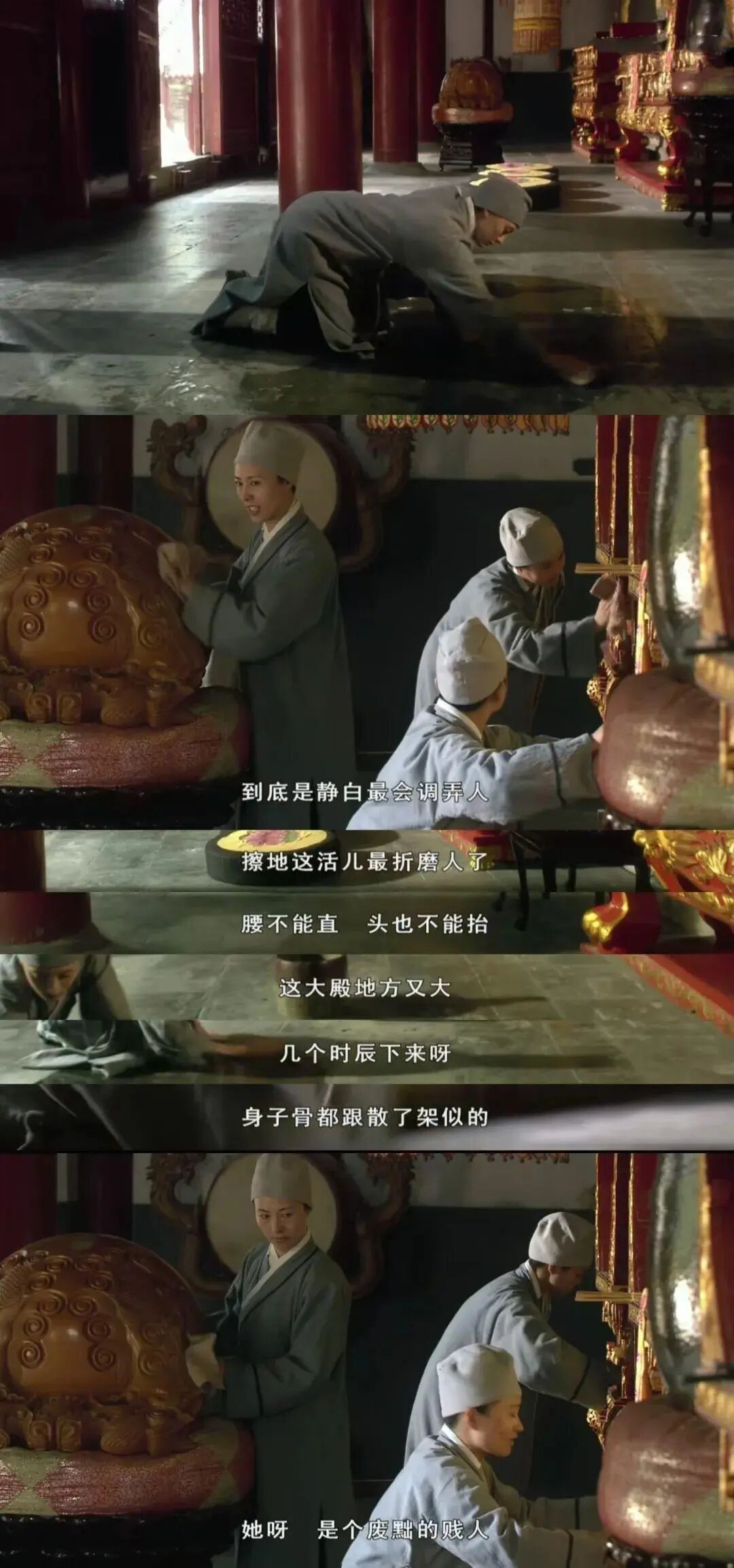 其它小尼姑也聚在旁边看好戏,一边讨论“还是静白最会调教人”,一边恶语伤人“她呀,是个废黜的j人”……丝毫都不避讳甄嬛能听到。
