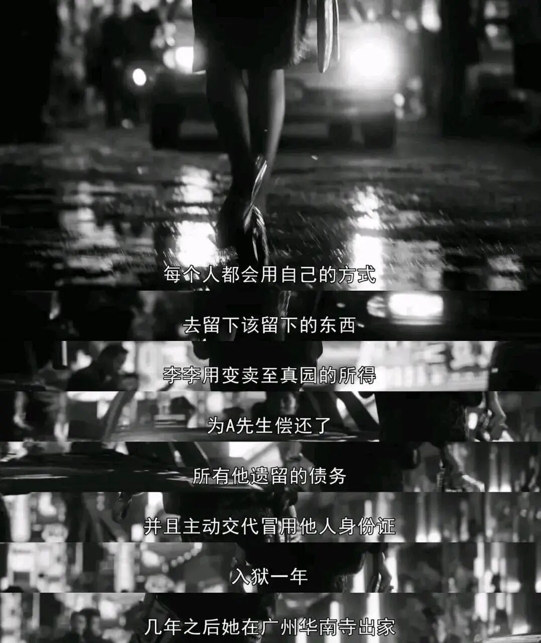 关于李李,当初她揣着一张3000万的流水单,盘下了金凤凰。两年里生意日进斗金,故事尾声,她变卖所有资产,还清了恩师A先生欠下的上亿债务,出狱后落发出家。