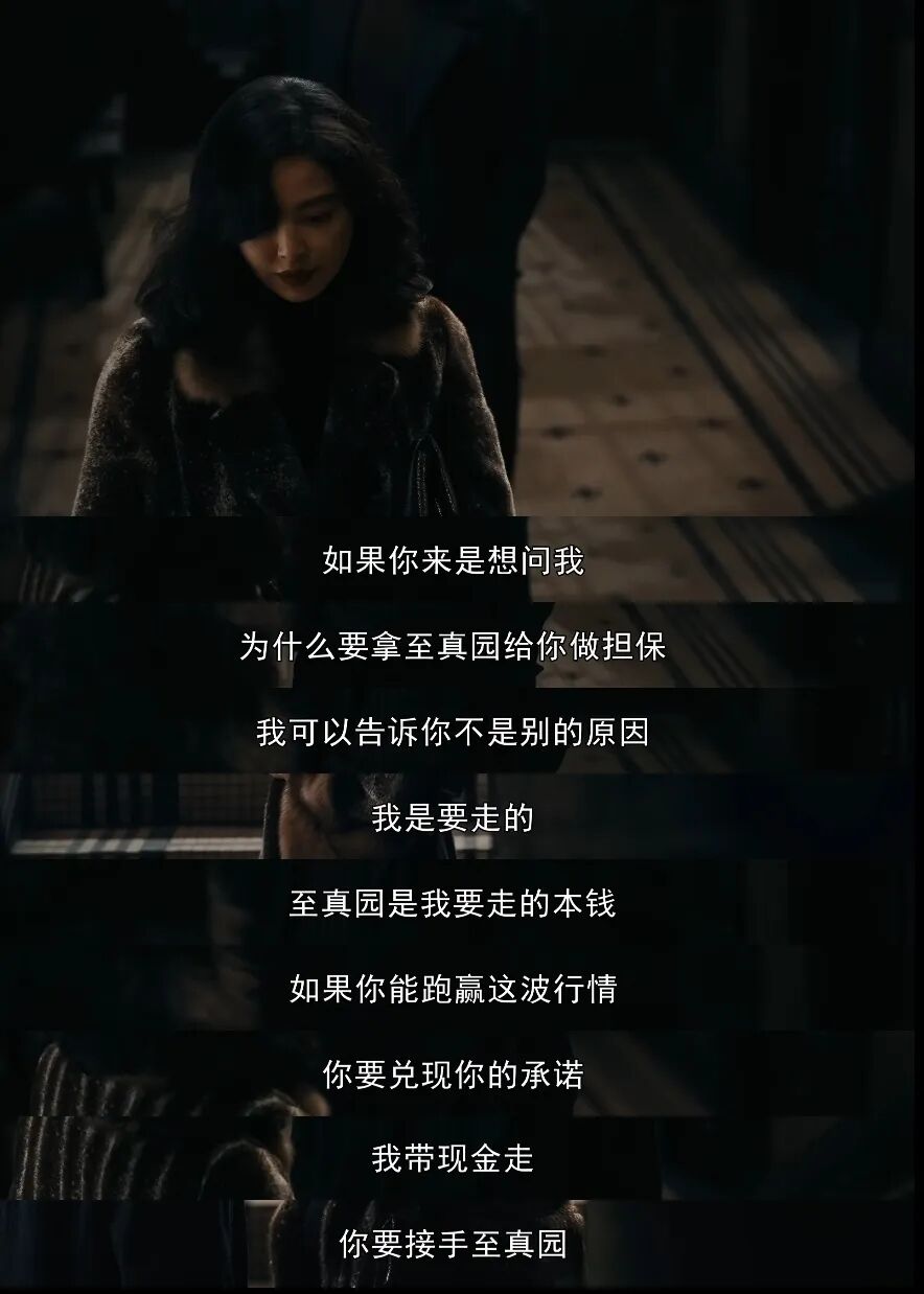 两人再见面,关系仿佛大变样,李李态度疏离,但还是坦诚了自己的目的:我是要离开的 ,至真园就是本钱 ,如果你赢三方一起赢,我也会赚到更多钱。如果你输,我和林太则随时撤出,输的只有你一个。
