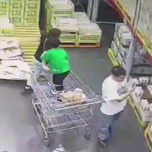 5.1假期期间,广东深圳,有位女士带着一个小孩去超市购物,哪曾想意外就在这时发生了。只见这位女士从商品堆头上拿了一件东西,急急忙忙地放在身边的购物车上,然后就转身欲推起购物车走,没想到在购物车上的绿衣服小男孩没站稳,一个踉跄就往后直接倒摔在了地上。