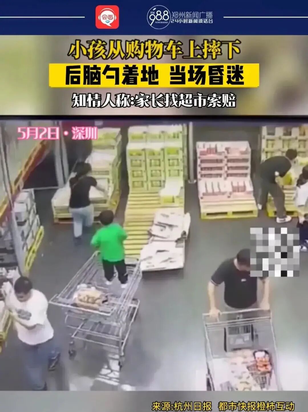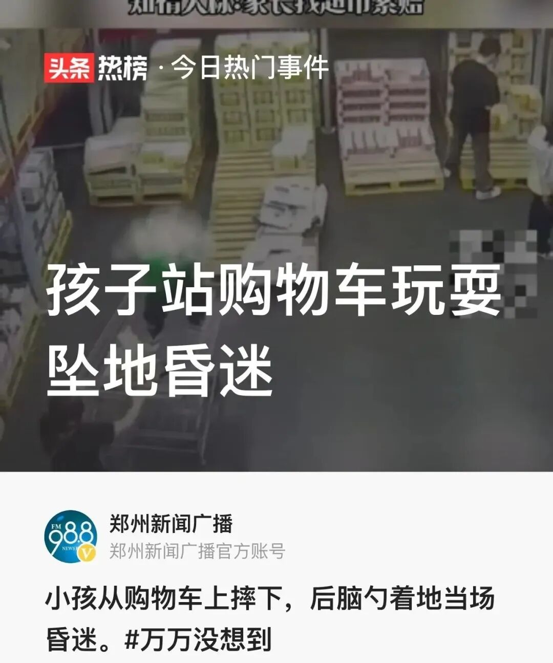 具体到这件事,明显是家长疏忽大意了,孩子在购物车上还站着呢,就急急忙忙地推购物车,孩子因此而摔倒在地。