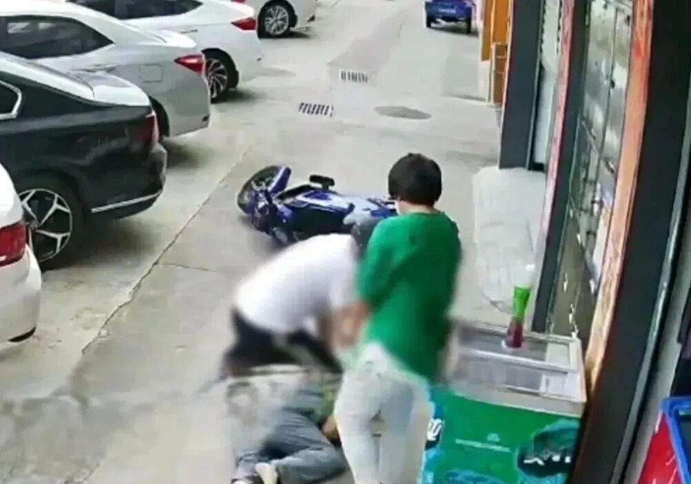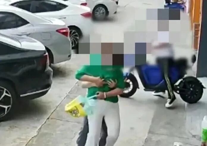 这个陌生男子在经过绿衣服女士的时候突然从背后抱住女士一顿乱摸,儿子见状急忙丢下摩托车,一跃冲了上去将坏蛋按倒在地!