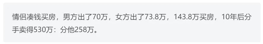 结果两人在同居10年后分手了。女方就将房子卖了,卖了530万元。