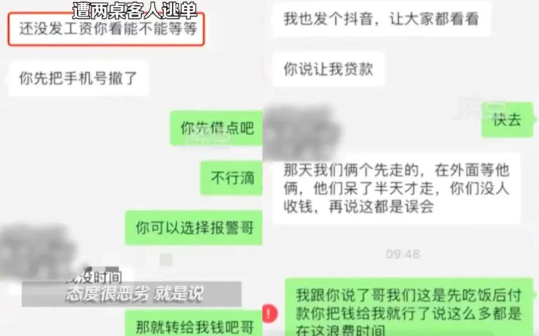 其中,有一桌的客人一直是联系不上,不接电话;还有一桌加上了微信,却各种找借口赖着不付钱。说什么“还没发工资看能不能等等”......"我要是老板你,我就认了......”,还说"是你们没人来收钱......"
