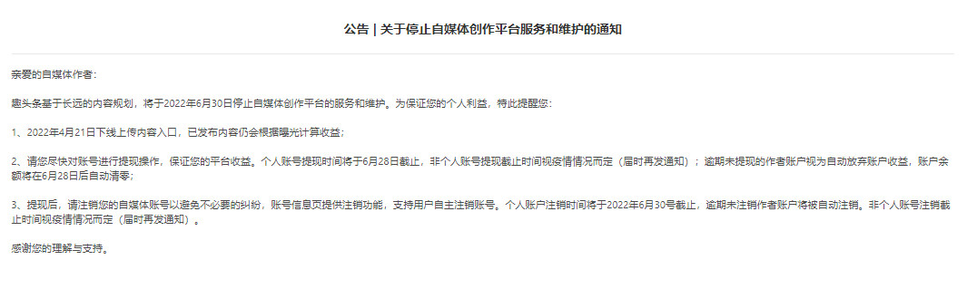 据了解,趣头条(US.QTT)在4月21日发布了一个公告,基于长远的内容规划,将于2022年6月30日停止自媒体创作平台的服务和维护,并在当天下线内容上传入口。