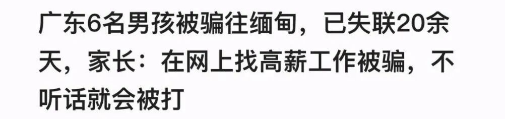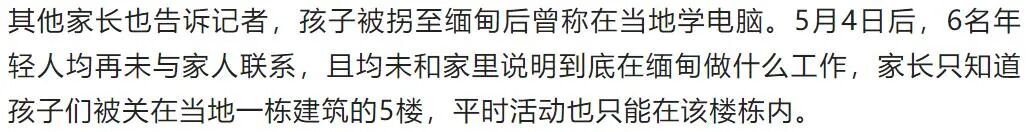 据其中一位家属介绍,小伙们均是在网络上寻找高薪工作的时候,不慎落入了骗子的陷阱,这6名小伙中,最大的不过20岁,最小的才17岁,都是初中学历,来自广东普宁里湖镇。当他们在网上看见有高薪的工作岗位招聘时,就打算去那里上班挣钱,没想到现在钱也没挣到,自己还被骗去了云南边境,之后又被骗子转折带去了缅甸。
