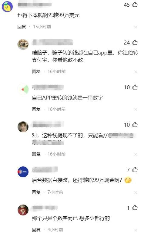 有网友觉得骗子这次也是下了大本钱了,竟“真”转了99万美元给女子,但聪明的网友马上出来科普:这个他只是在APP里转的,只是一堆数字,改成几百万,一亿都没问题,你如果让他转到你现实的卡里他就没办法了。