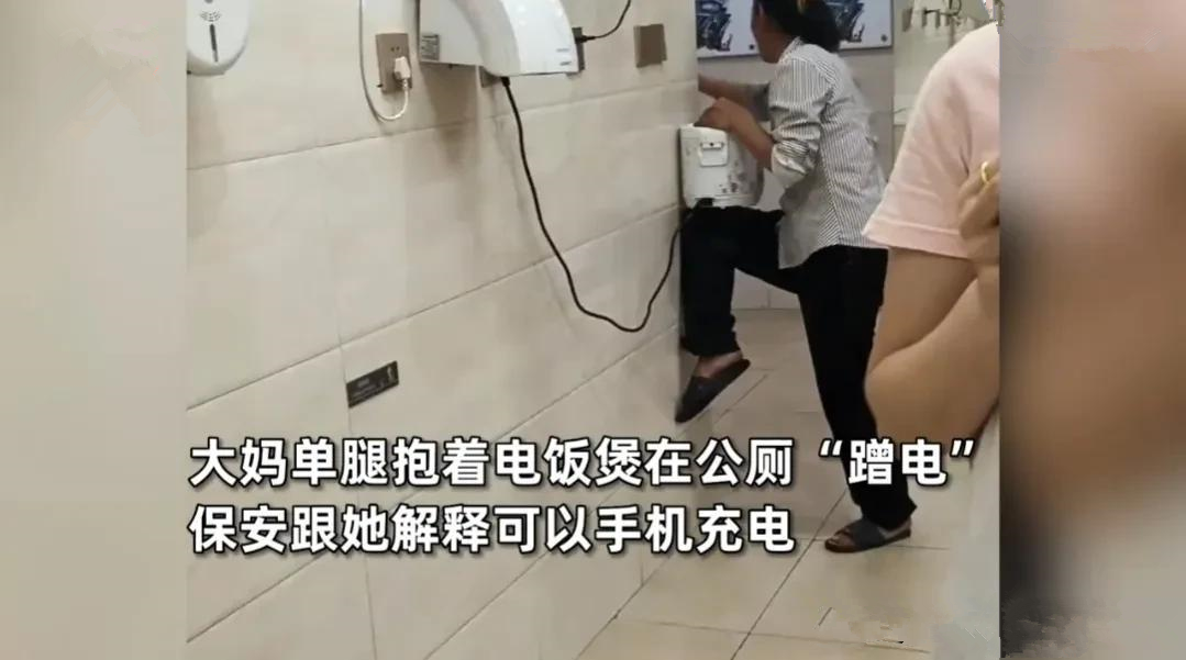 比较奇葩的是她不是在蹭电充手机,也不是蹭电充电自行车,而是在这个厕所里蹭电,抱着个电饭煲做起了饭。