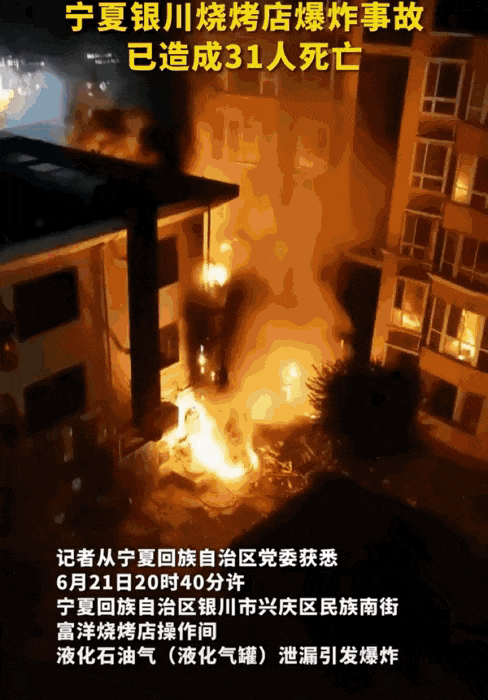 端午节前的夜晚八点多,宁夏银川一烧烤店突发煤气爆炸,事故造成31人遇难,7人受伤送去急救。