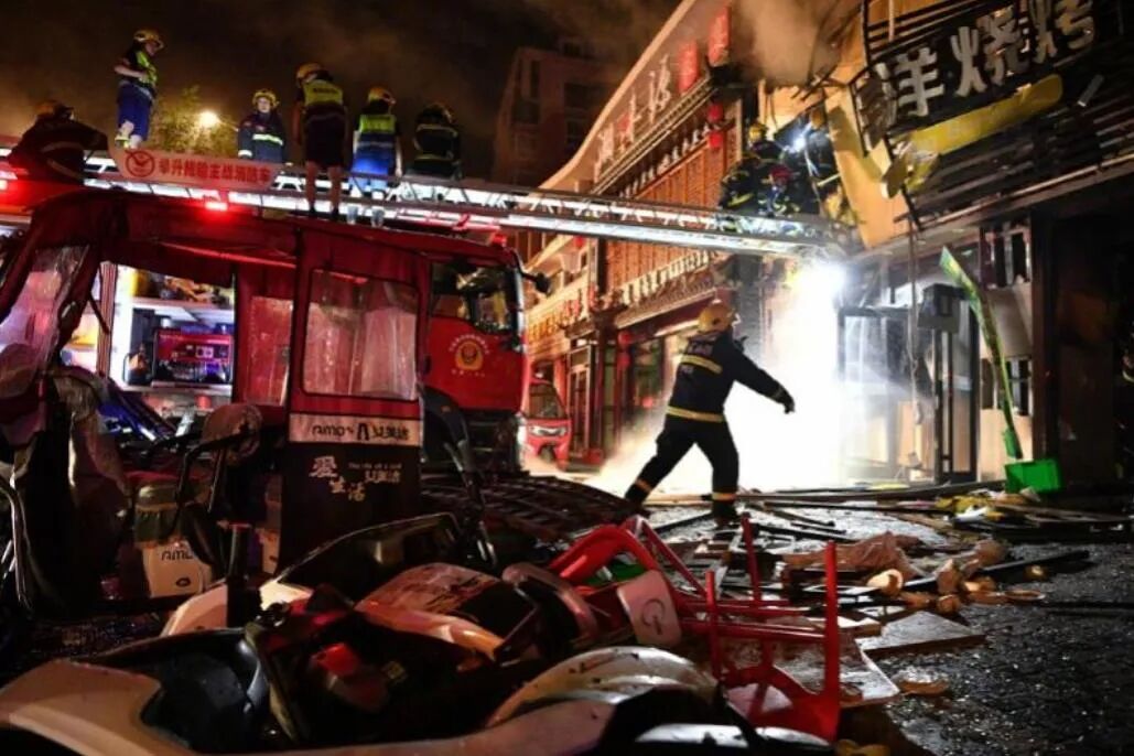 这个烧烤店当时发生了两次爆炸,起初应该是一楼的煤气罐爆炸,后来又引起了二楼的天然气管道爆燃。