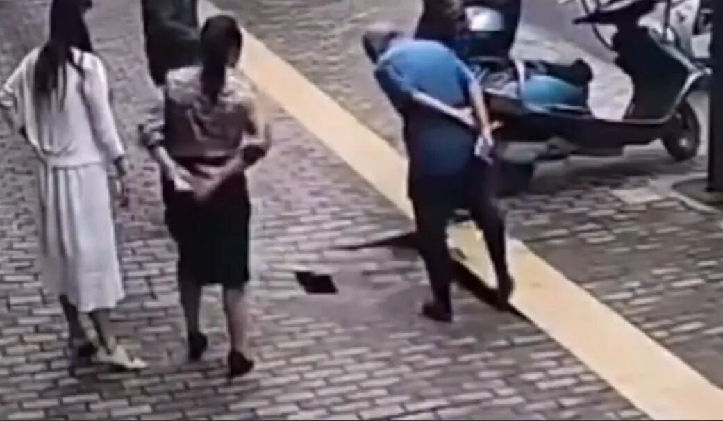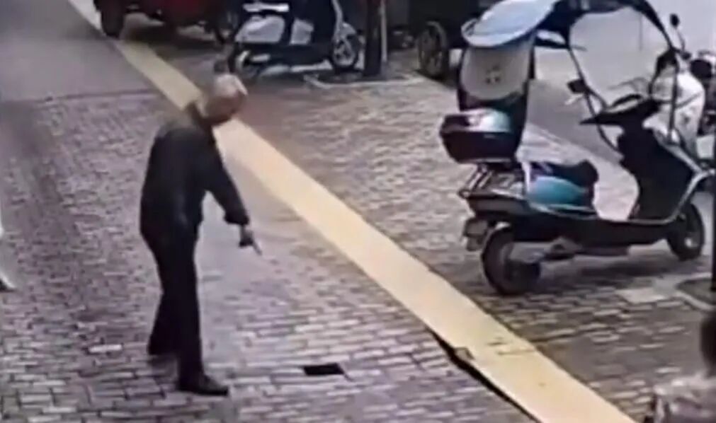 其中一位蓝衣老大爷就这样踩到本就较为不稳的路面上,导致原本的小洞周围地面瞬间坍塌,这位老人家也就此掉进了黑洞里。