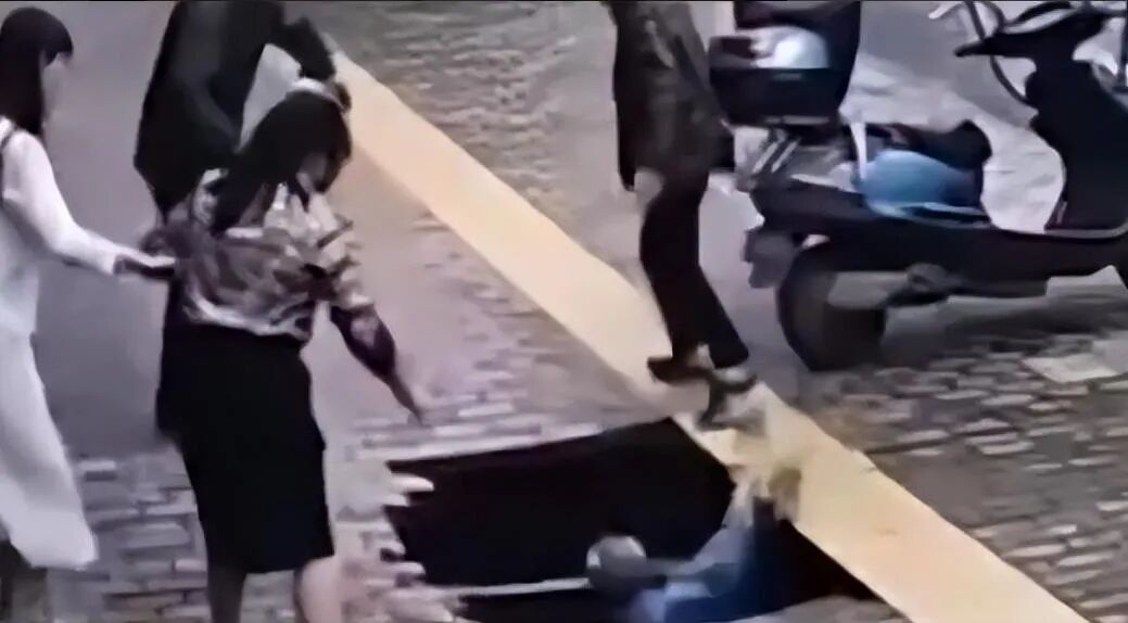 近日,在四川广安,一处地面人行道意外坍塌,导致旁观的一位老人不慎落入坑洞里。