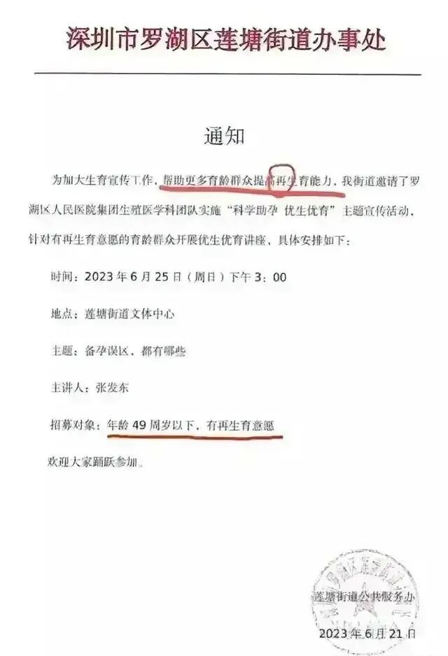 近日,一则深圳某街道办事处发出来的讲座通知让人大跌眼镜,文中写了本次讲座的主题为“科学助孕,优生优育”,招募对象49岁周岁以下有再生育意愿的群众来听讲座,这不就是鼓励75后再生育吗?由此引发大众热议。