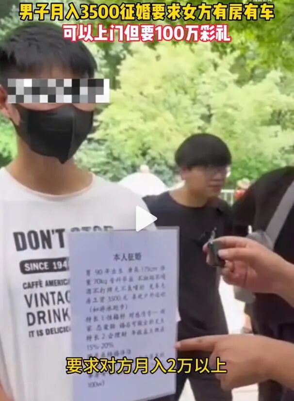 此外,男子还说自己可以接受上门做赘婿,不过前提是女方要给100万元的彩礼,这样自己平时可以少和父母走动或不走动,他还说这100万元是留给他父母的。