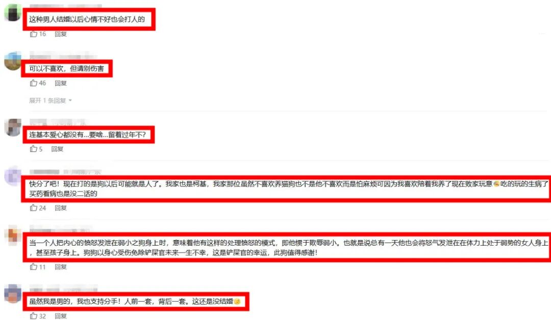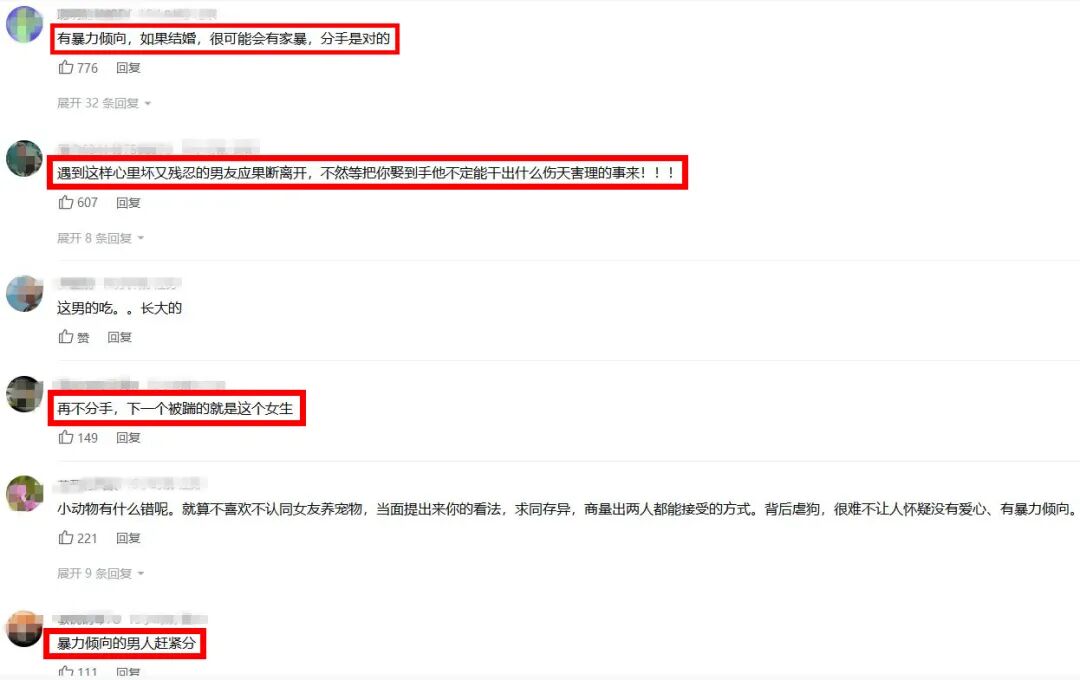 大部分网友表示支持这位女子的决定,认为男子虐待动物的行为是不可取的,而且她男朋友因此还暴露出有暴力倾向的性格问题,应该果断分手,如果不分,恐怕将来男子迟早会对女子动手。