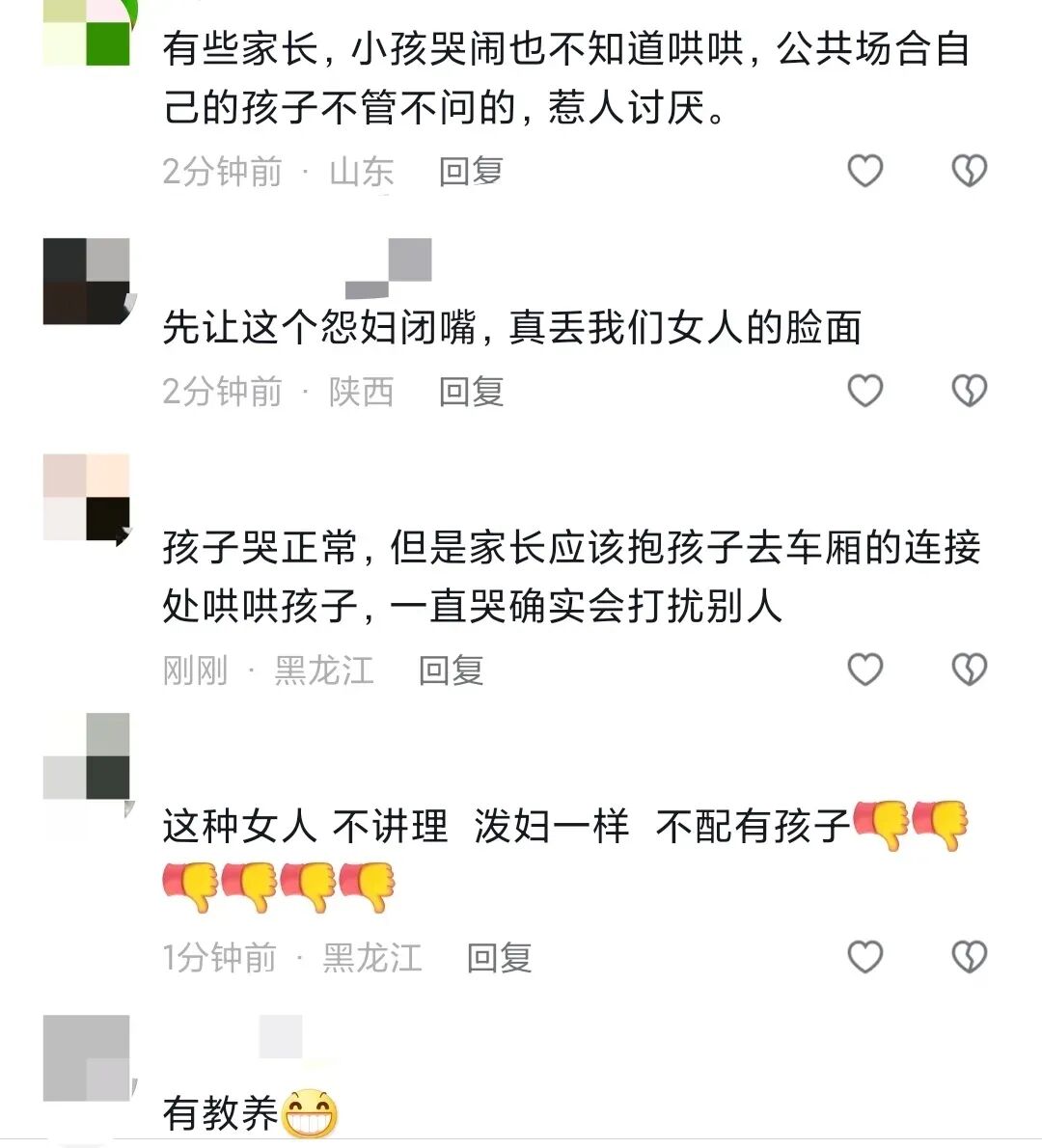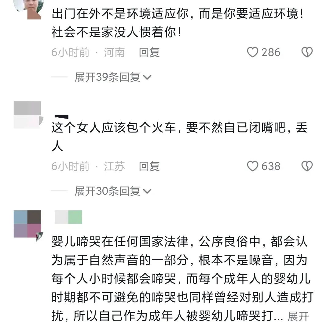 也有网友表示:人烦的时候遇到孩子哭闹是难忍受,但女子错在以不合适的态度去处理问题,在高铁这样的公众场合上遇到这样的事情,如果家长不作为,完全可以找乘务员去沟通,或是请家长带孩子到车厢连接处走一下,拍哄一下可能就好了。