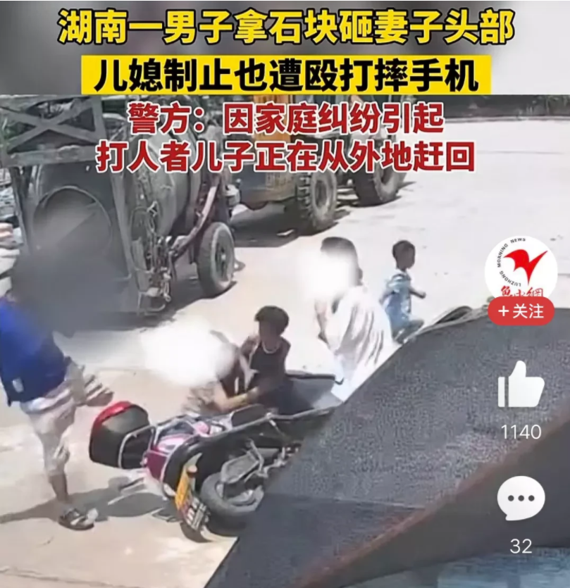 直到妻子和儿媳妇骑着电动车回到家,这男的早已憋了一肚子火气,随手拿起一块大石头就对着坐在车头的妻子头上狠狠砸下去,当时孙子也在现场。真不知道这样的场景对小孩子幼小的心灵造成了多大的伤害,怕是一辈子都忘不了了。