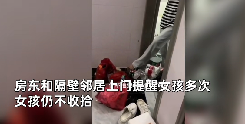 正如视频中所见,当房东与邻居上门来沟通的时候,女孩居然仍是不情不愿地用脚拨拉着房门口那些垃圾,面对房东与邻居的质问女孩说道:我不是故意的,我是生理期不舒服,所以没有及时倒垃圾。