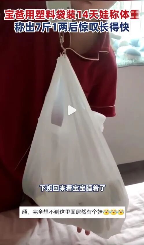 近日,江西九江有位新手宝爸,孩子刚出生14天,他想知道孩子长大没有,长大了多少,但身边又没有体重称,但有个弹簧称,就突发奇想出一个称重“小妙招”,那就是把自己的新生小宝宝装在一个大塑料袋里,勾在弹簧称上称重。结果称出来7斤1两,惊叹孩子长得快。