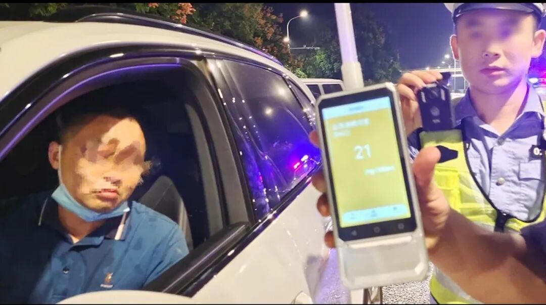 接着,一位交警对开车的驾驶员进行了呼气式的酒精浓度测试,探测到其血液中的酒精浓度为21毫克/100毫升,这个数值已经达到了酒后驾驶的标准。