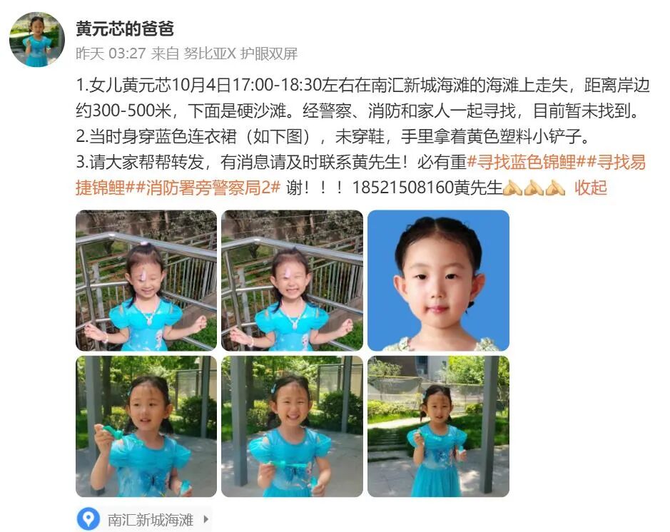 10月5日,4岁的黄元芯小朋友的父亲在自媒体账号上发布了一则《寻人启事》,声称女儿4日傍晚在一海滩边失踪。