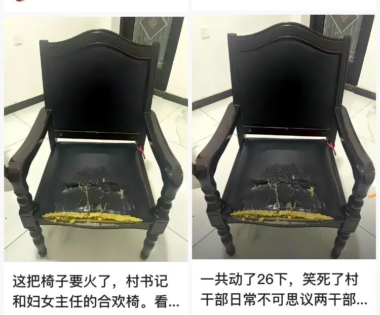 另有网友说:这是有故事的椅子,都让村干部和妇女主任磨破了,他们这只被拍到了一次,但熟练程度都肯定是老搭档了。
