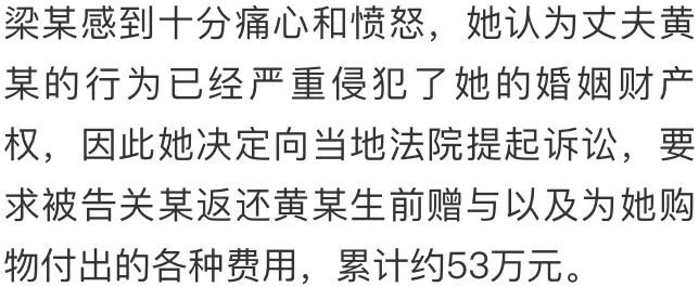 这个秘密在丈夫去世后终于被梁某发现了,一天,她偶然间发现了黄某和关某的秘密关系,以及黄某私下赠与关某大量财物的证据。