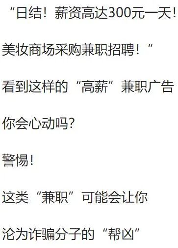 导语:大学生兼 职首日便“进账”10万元?事有蹊跷,勿上当!