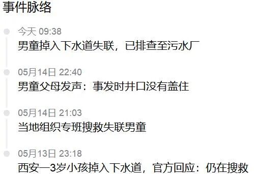 5月12日晚21时左右,在西安市未央区惠西村,因下雨路面积水,一名3岁男童在与家长走访亲友准备回家的途中,不慎掉入下水管道,被水冲走。