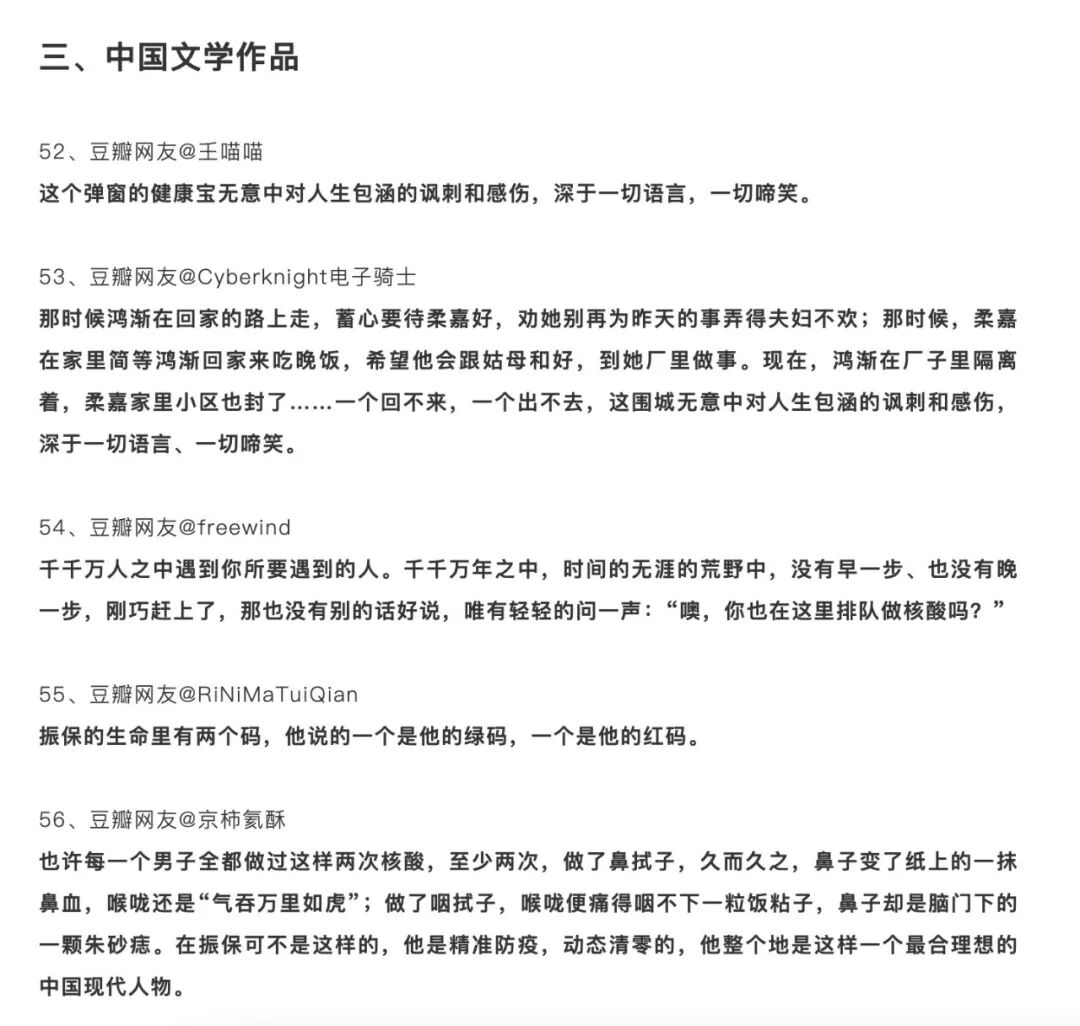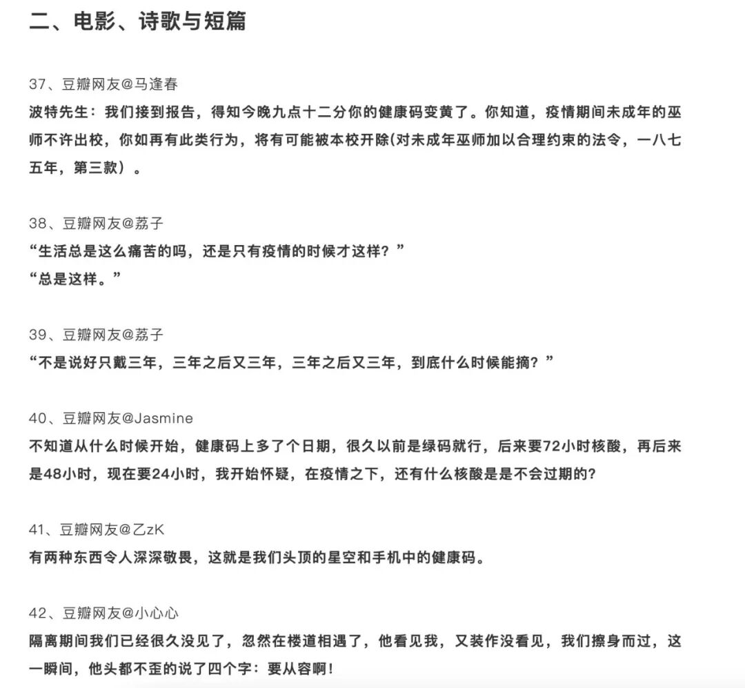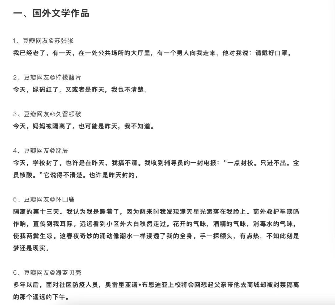 那篇公号文章《一条豆瓣动态引发的“疫情文学”复兴》还列出了大部分豆瓣网友的所谓的“疫情文学表达”,细分出了“国外文学作品”、“电影、诗歌与短篇”、“中国文学作品”几大类别。
