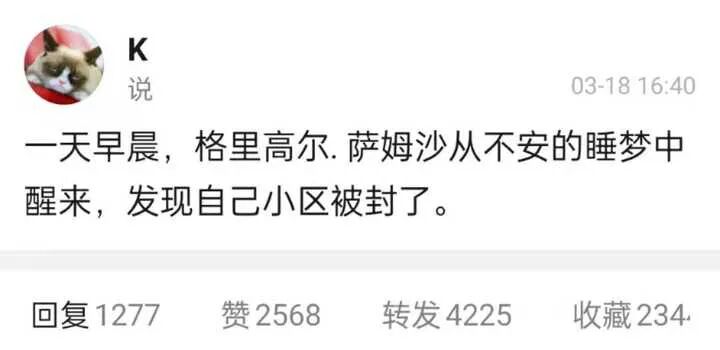 近日,网帖《一条豆瓣动态引发的“疫情文学”复兴》在朋友圈刷屏。此贴起源于3月18日豆瓣网友@K模仿卡夫卡经典作品《变形记》开头所发的一条动态:“一天早晨,格里高尔·萨姆沙从不安的睡梦中醒来,发现自己小区被封了。”