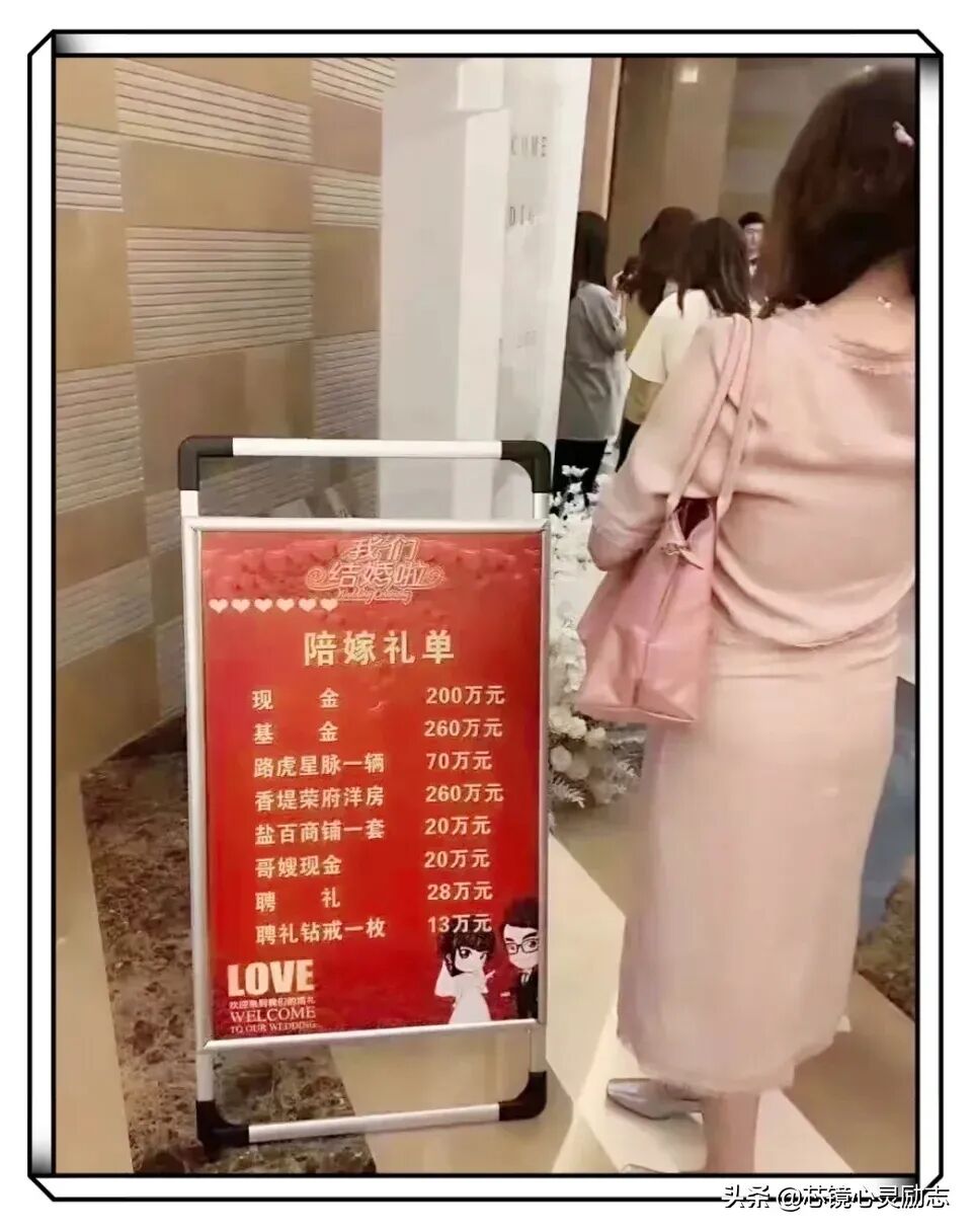 这陪嫁礼单真是让人羡慕嫉妒,太引人注目了:现金200万,基金260万,路虎星脉一辆70万,香堤荣府房子260万,盐百铺子一套20万,歌嫂现金20万,聘礼28万,聘礼钻戒一枚13万。反正小编我是今天才见识到,这个新娘的娘家真是豪。不知道这是哪个地方的陪嫁礼单,有人说是新娘买大赠小而来的,那这个新郎是高兴还是不高兴的好啊?如果是你愿意不?哈哈,估计这只是看红了眼的网友们饭后的调侃吧。。但群里真的有人说:我愿意,数数人数还不少!就这些陪嫁的财产都够平常人奋斗半辈子甚至一辈子了,很多人辛辛苦苦地,没日没夜地干活,也未必能得到这么多。真是同人不同命,任旁人再羡慕嫉妒也没用。有人就是天生含着金钥S出生,有人不用嫁入豪门,本身就是豪门。。我在梅州是没见到过这样直接在婚礼上把陪嫁礼单公开的,你们那边有这样的风俗吗?如果是种风俗,感觉如果家里不是很富裕的,这就有点尴尬啊。不写吧亲戚朋友会说你没有按风俗办,写吧又没多少东西没啥好写的。这样看来好像不管咋整都是会被人说。现在的人结个婚不容易啊。说到这又想到如果家里生了两个女儿,一个女儿这样的待遇,那二女儿总要差不多吧。国家现在还提倡三胎,如果还有个三女儿,那这娘家真是不得了了。[捂脸]对此你怎么看?可以在留言区评论一下哦。