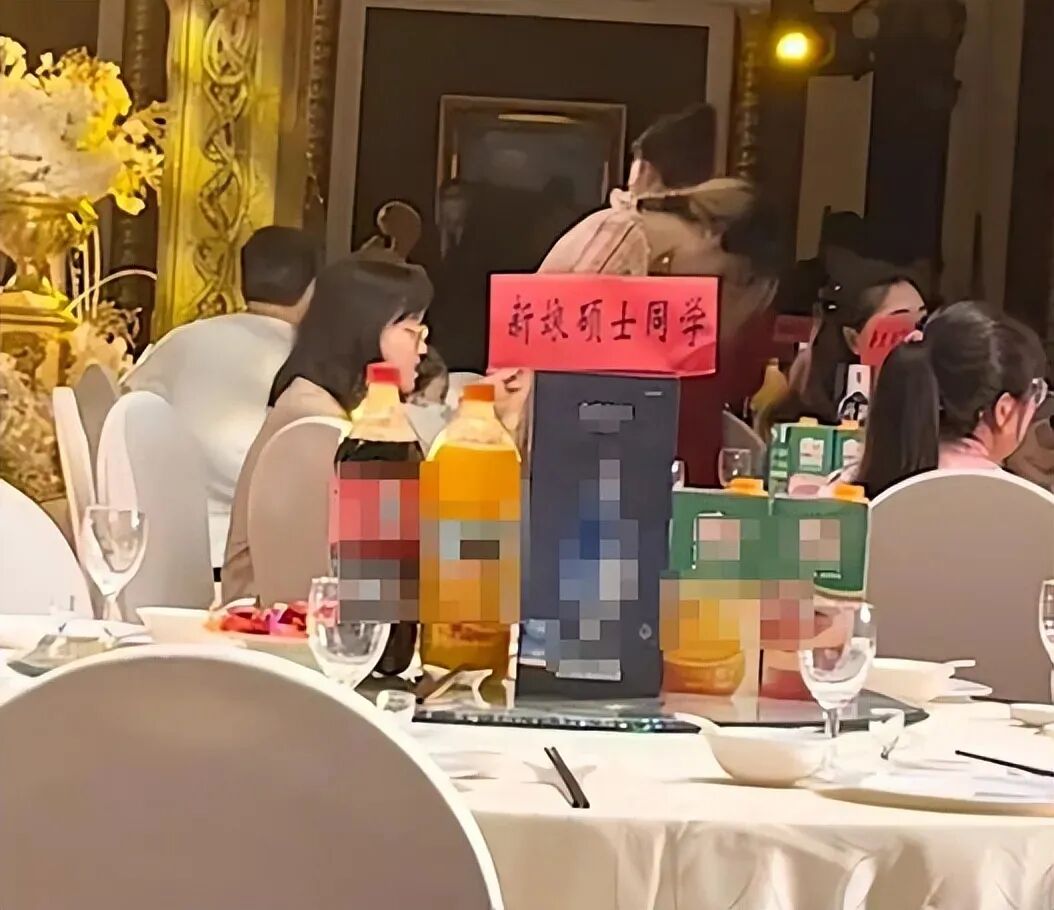 当天婚礼现场,新娘事先安排硕士、博士、中学同学分桌吃席,并在每张桌子上用醒目的红牌,标明了:“新娘博士同学”、“新娘硕士同学”、“新娘中学同学”。
