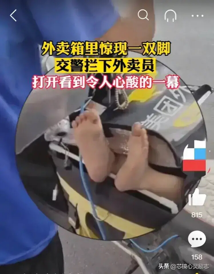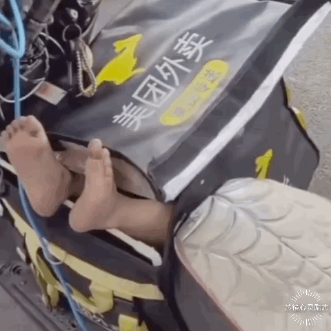 路上的摩托车外卖箱里伸出来一双脚?怎么回事?