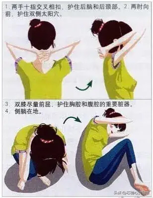 1-两手十指交叉相扣紧,护住自己的后脑和后颈部。