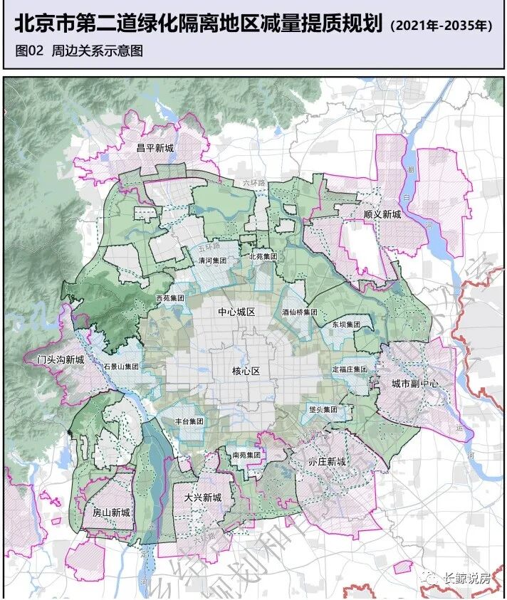这张附图的名称是周边关系示意图,透露的信息着实不简单,虽然是以绿化为圈层划分依据,但基本也契合北京楼市的分布,清晰的划分了北京的地域圈层。我们由内而外来看下: