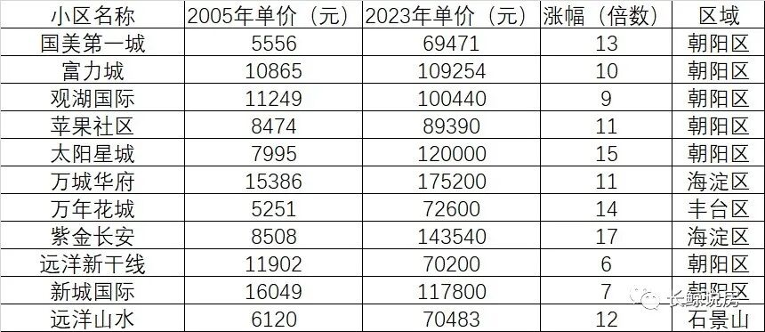 列了部分楼盘2005年房价和2023年房价的对比图,2023年房价数字是该小区的大致均价。