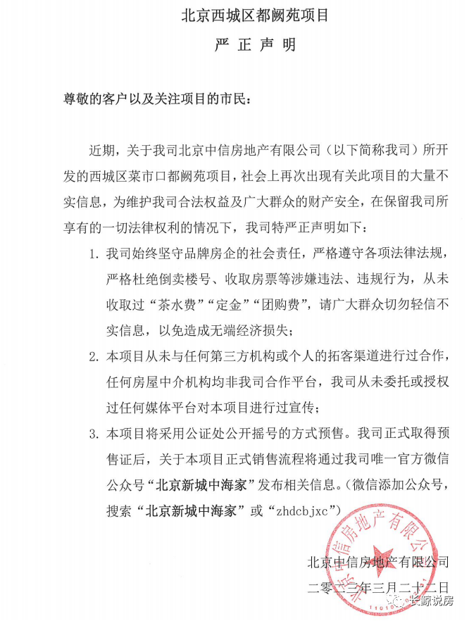 为了平息买房人的情绪,打消不切实际的想法,都阙苑还特别发了严正声明,反复强调从未收取过“茶水费”“定金”“团购费”;同时,都阙苑声明,本项目从未与任何第三方机构或个人的拓客渠道进行过合作,任何房屋中介机构均非公司合作平台。