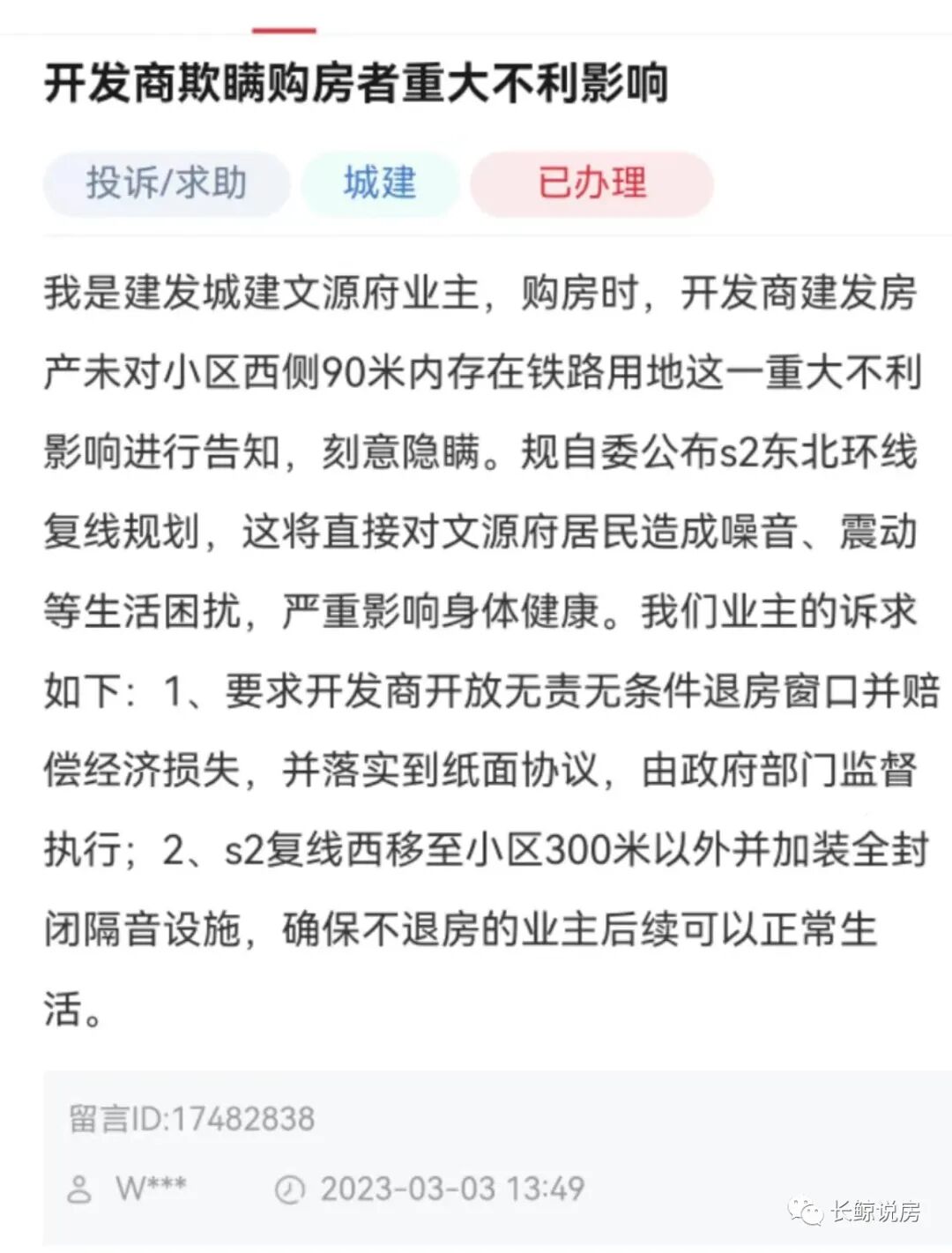 “我是建发城建文源府业主,购房时,开发商建发房产未对小区西侧90米内存在铁路用地这一重大不利影响进行告知,刻意隐瞒。规自委公布s2东北环线复线规划,这将直接对文源府居民造成噪音、震动等生活困扰,严重影响身体健康。”