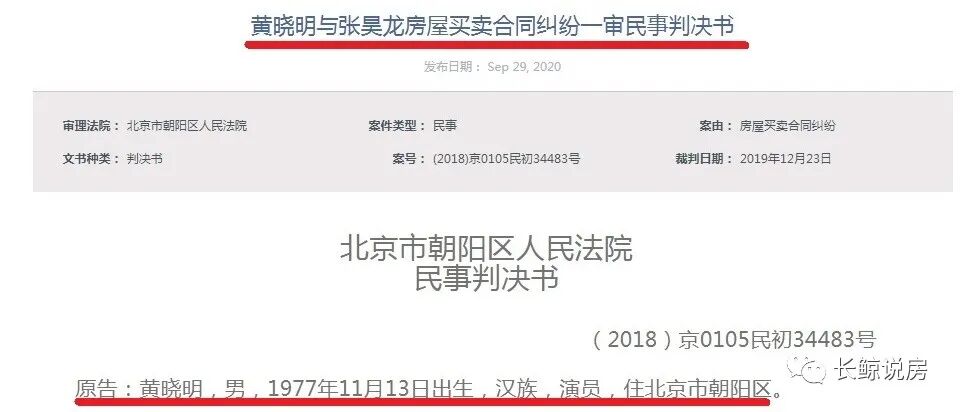 2020年9月29日,北京法院审判信息网公开了一份判决书,这份判决书的主角是黄晓明和张昊龙,事项是房屋买卖合同纠纷,判决书全名是“黄晓明与张昊龙房屋买卖合同纠纷一审民事判决书”。