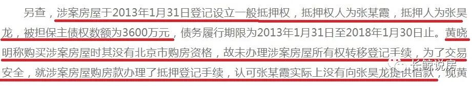 2013年签订买房合同后,他也准备了后手,以防万一。为了防止卖家违约,黄晓明给这套房子登记设立了抵押权(2013年还可以办理个人房产抵押登记),抵押权人就是黄晓明的母亲,抵押人是张昊龙。大意是张昊龙跟黄晓明的老妈借了3600万,用房子做抵押,借款时间2013年到2018年。