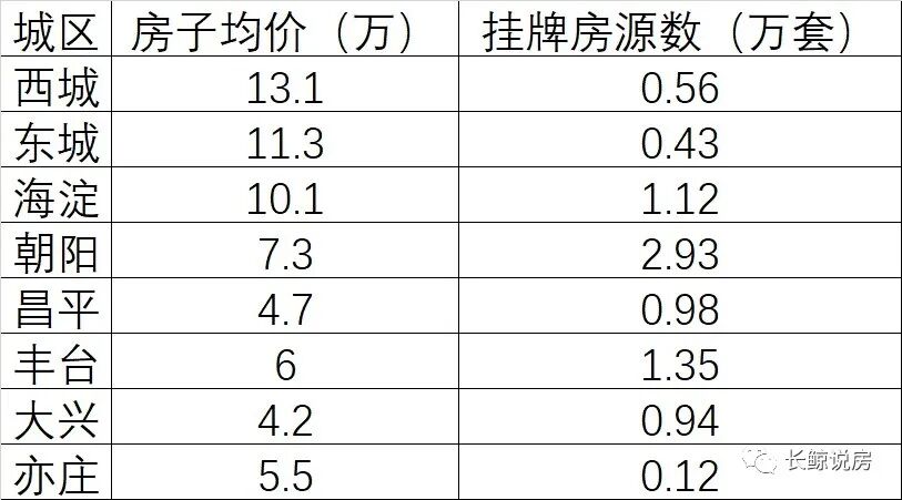 这几个区,一方面房子均价高,另一方面房源挂牌数量大。比如海淀,房子均价超过了10万,挂牌数量比东西城加起来的房子数量还要多。均价高+房源多,说明这个区域的房产市场实力比较强。