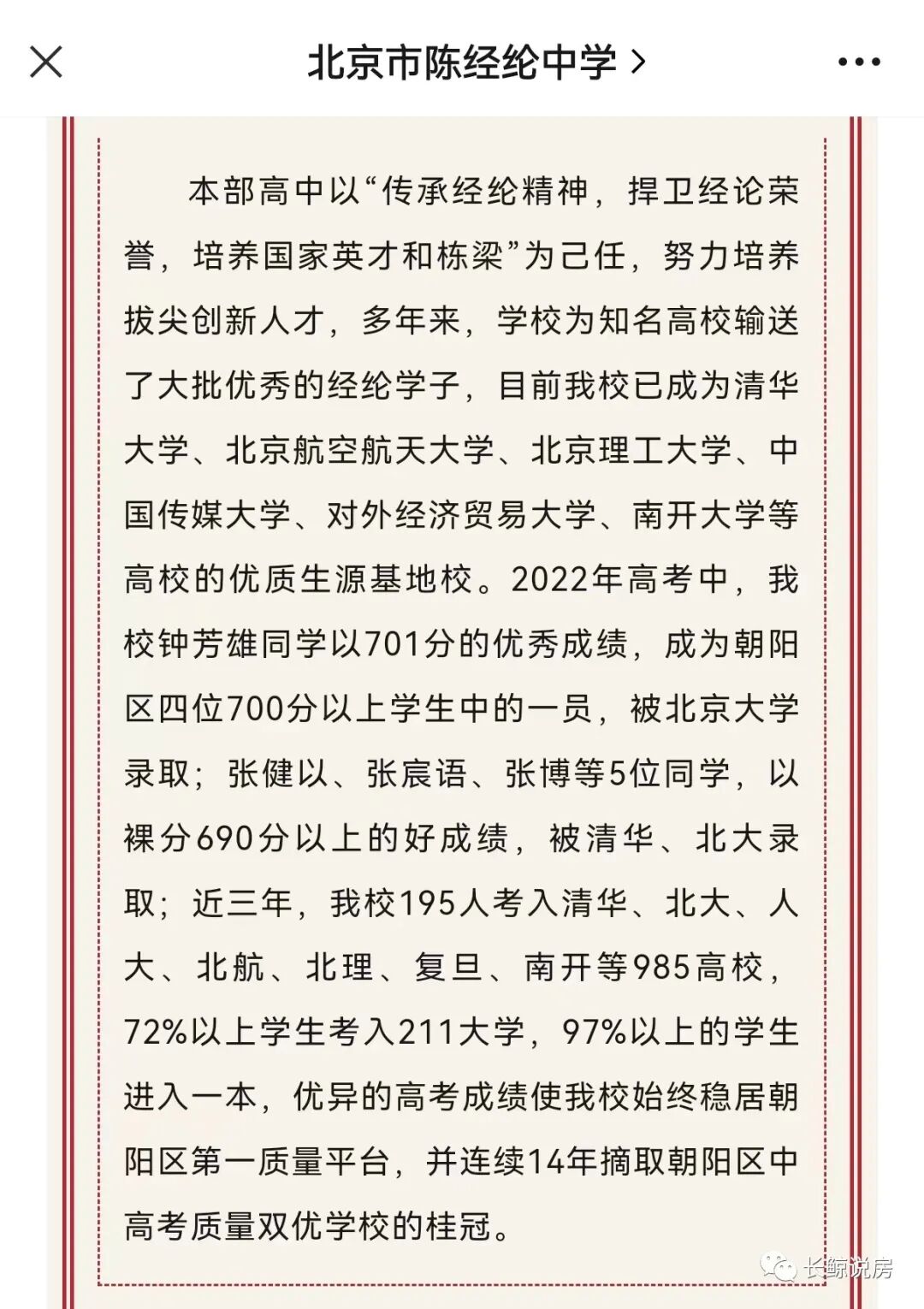 我们来看下这个成绩,22年,陈经纶有6名学生被清华、北大录取。这个人数并不多,海淀有不少学校超过这个数字。