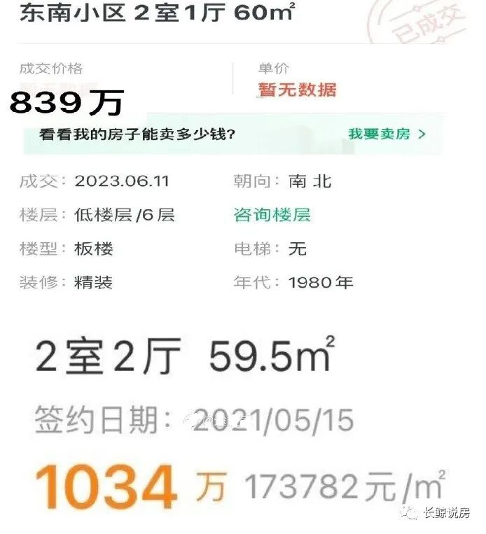 然后有两张配图:一张显示的是今年6月11日成交价839万;另一张显示2021年1034万。