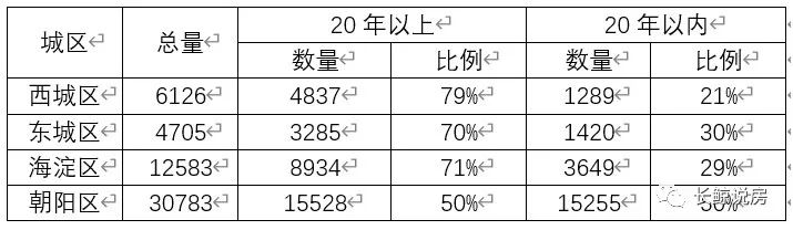 按照最新挂牌数据,我做了一个统计20年以上房龄的房子,西城区占比79;东城区竟然只有70%;海淀区的比例为71;朝阳区的比例最低,只有50%,跟建成时间更晚密切相关。