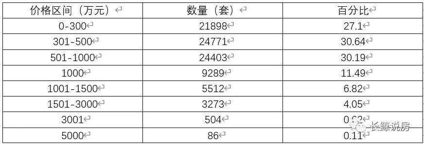 总价1000万以内的房子,共有71072套,占比87.9%。总价1000万以上的房子,有9189套,占比11.49%。