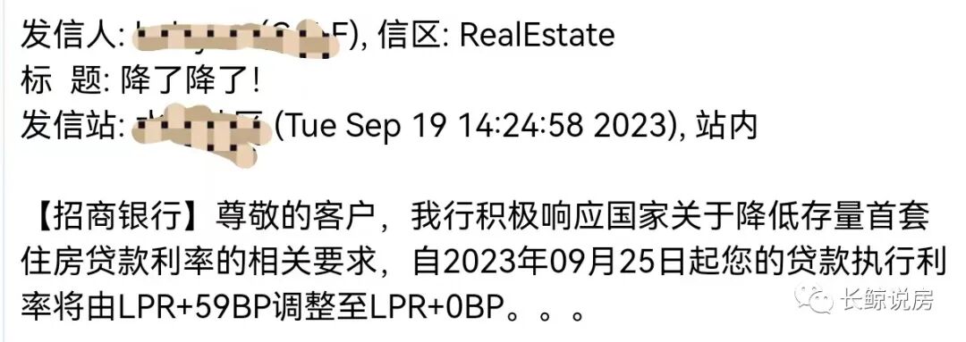 有网友发消息,收到了银行调整按揭贷款利率的短信,自2023年9月25日起,贷款执行利率由LPR+59BP调整为LPR+0BP。
