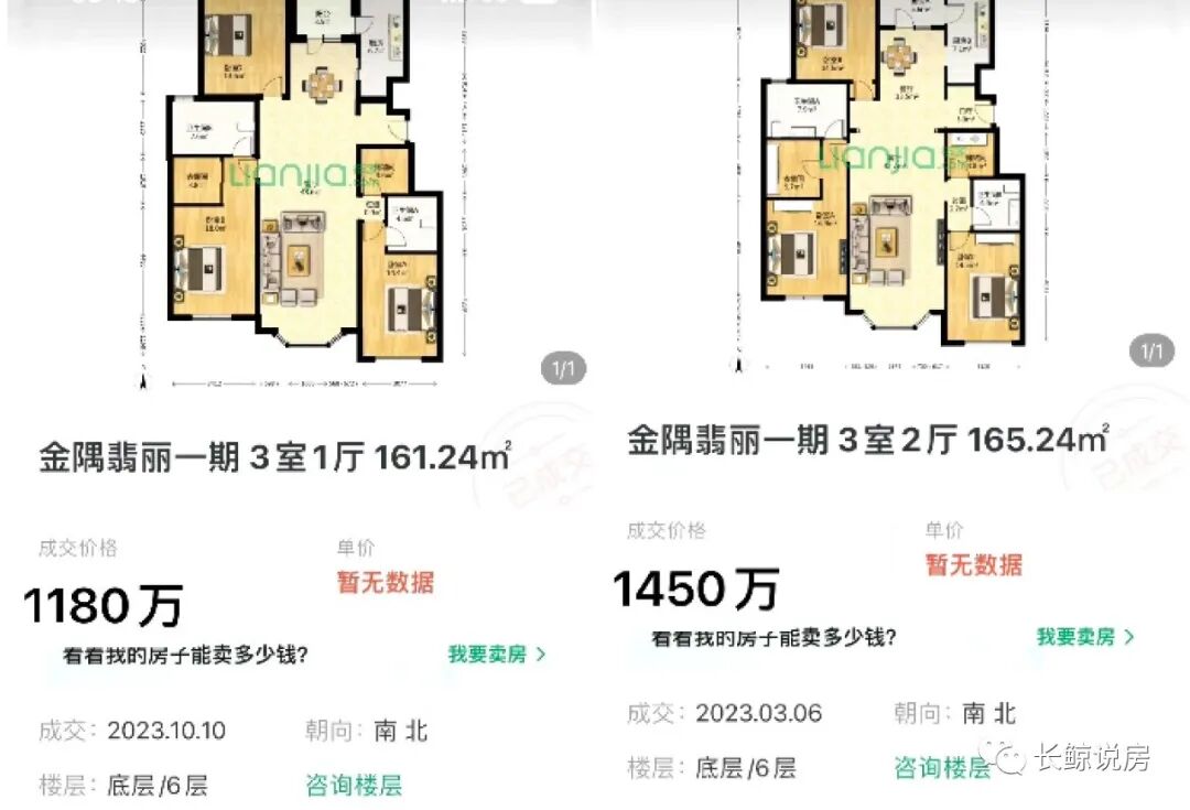 10月份,金隅翡丽一期三居室成交价1180万;7个月前,类似面积户型的房子成交价是1450万。将多出来的那几平米面积扣除,上半年3月的成交价大概也是1400万。