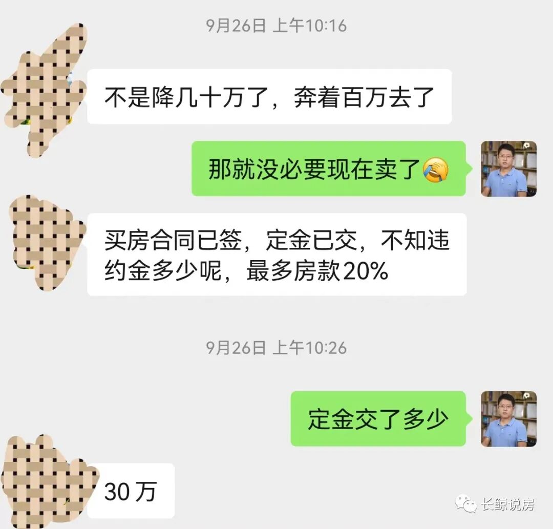 还有个置换房产的粉丝,签订了买房合同,结果自己的房子没有及时卖掉,已经降价将近百万。即使顺利卖掉房子,资金缺口也比较大,虽然支付了30万定金,也考虑违约了。